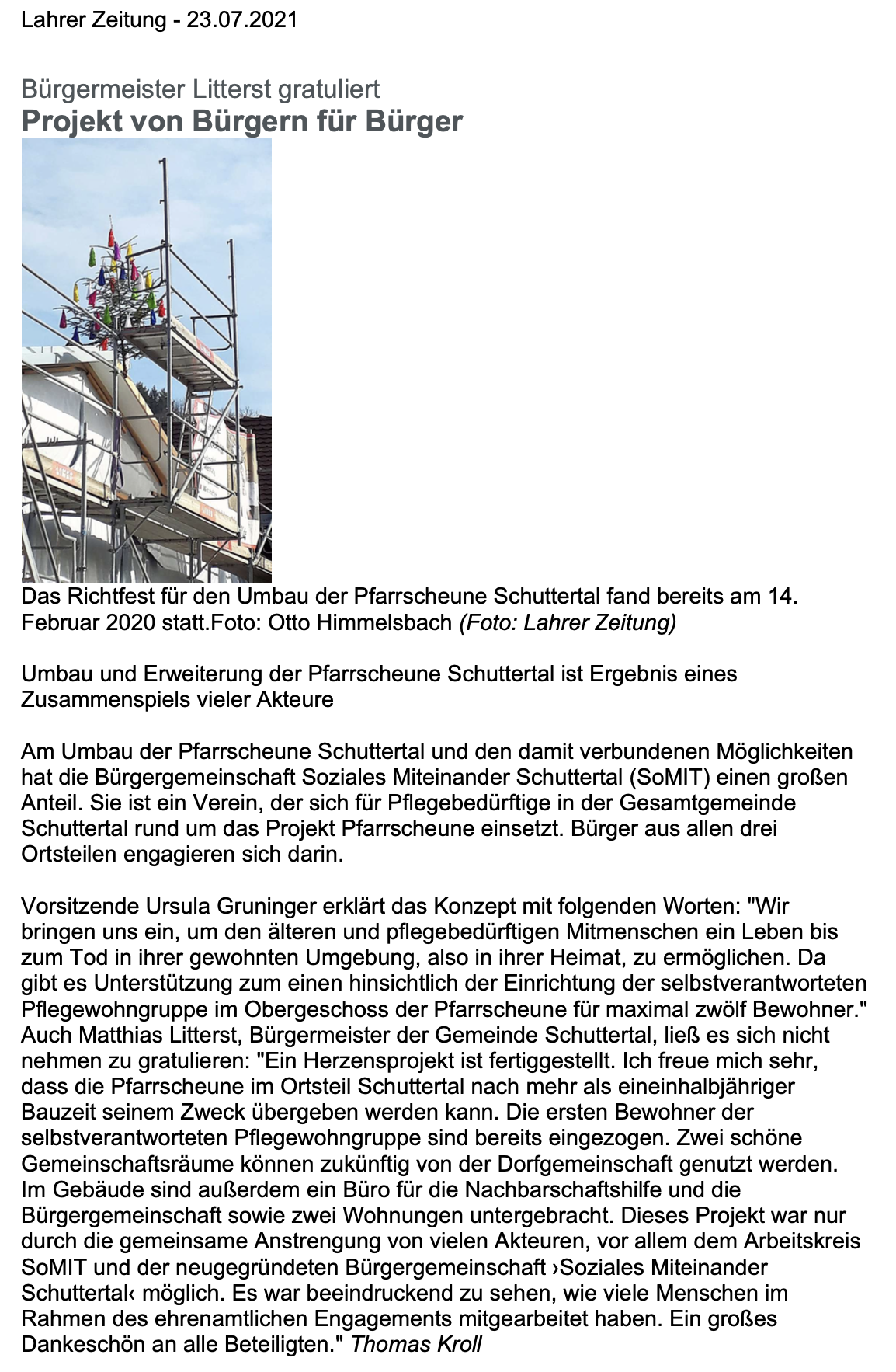 Auszug aus dem Bericht in der Lahrer Zeitung vom 23.07.2021: „Umbau und Erweiterung der Pfarrscheune Schuttertal […]